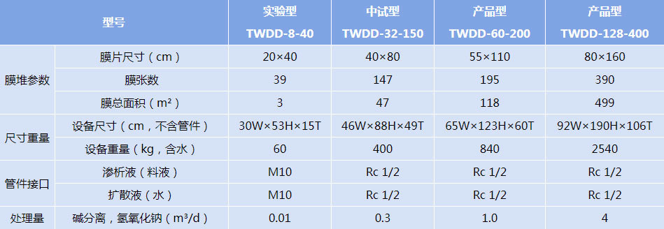 備注:上述數據均為參考值,而非設備的性能保證值,表格中的數據可能變更;堿回收擴散滲析器可用于處理氫氧化鈉、氫氧化鉀、氫氧化鋰。