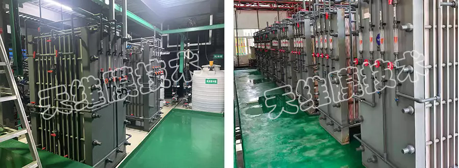 有機顏料生產過程中產生大量高濃度氫氧化鈉和有機物廢液,采用擴散滲析裝置將氫氧化鈉和有機物分離,分離后的氫氧化鈉補濃后返回原工藝繼續使用,而降低堿度后的有機物再用于提取顏料。本項目既解決了高堿高COD廢液排放問題,又有效地回收了氫氧化鈉和顏料。 項目現場